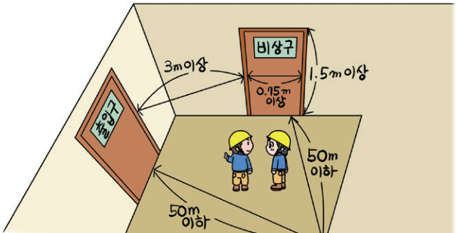 2. 작업장의 각 부분으로부터 하나의 비상구 또는 출입구까지의 수평거리가 50미터 이하가 되도록 할 것.